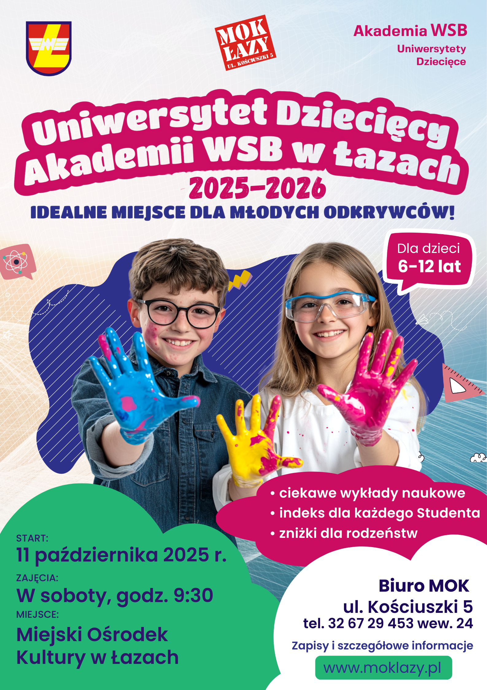Miło nam poinformować, że już od 11 października rozpoczynamy kolejny rok akademicki Łazowskiego Uniwersytetu Dziecięcego Akademii WSB, gdzie uczestnicy mogą poszerzyć swoją wiedzę z różnych dziedzin oraz odkryć pasję a także poznać świat nauki. Zajęcia realizowane są wspólnie z Gminą Łazy pod honorowym patronatem Burmistrza Łaz – Macieja Kaczyńskiego. Kierowane są one dla dzieci w wieku 6-12 lat a odbywać się będą w sali Miejskiego Ośrodka Kultury w Łazach w jedną sobotę każdego miesiąca począwszy od października 2025 roku do czerwca 2026 roku (oprócz grudnia).